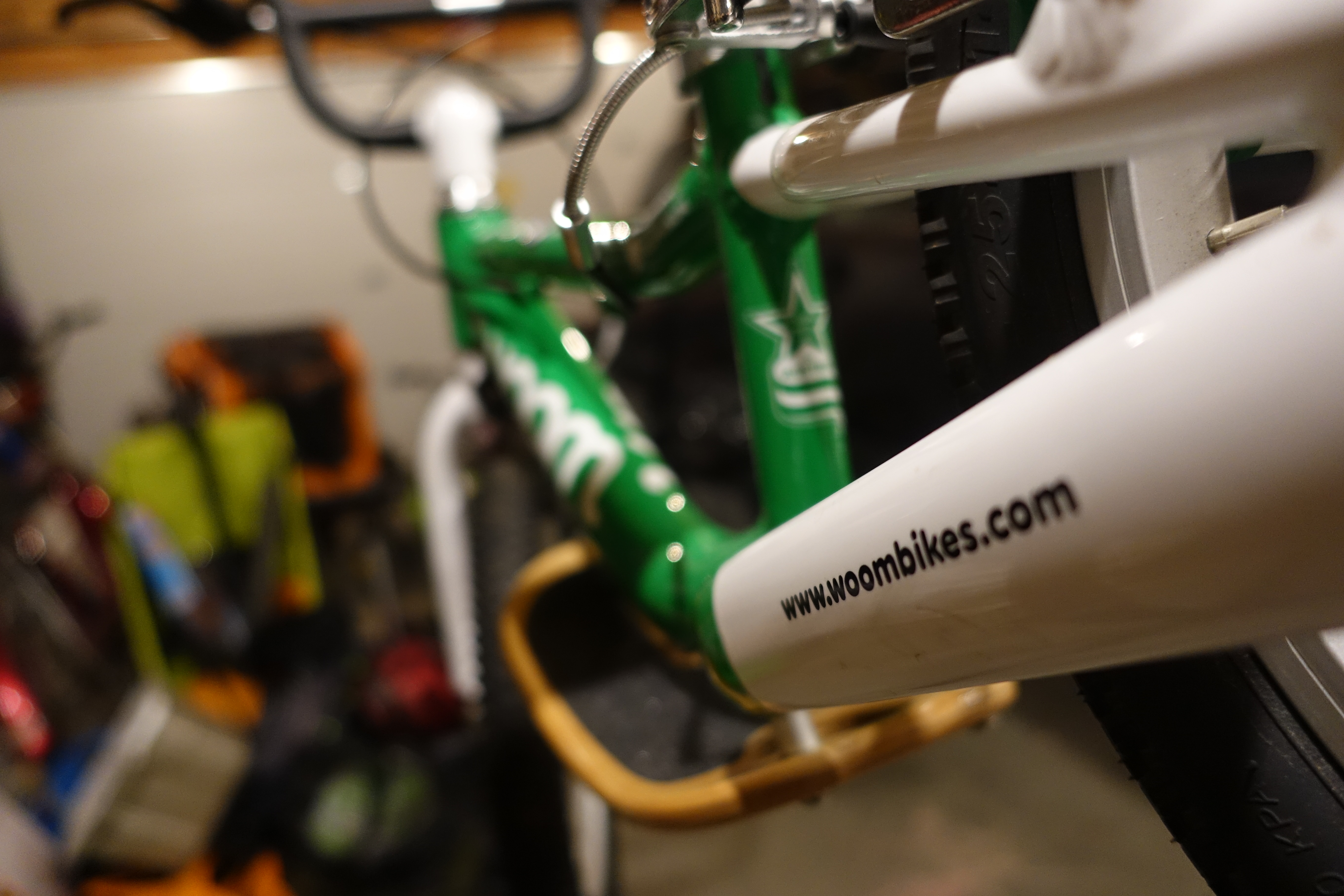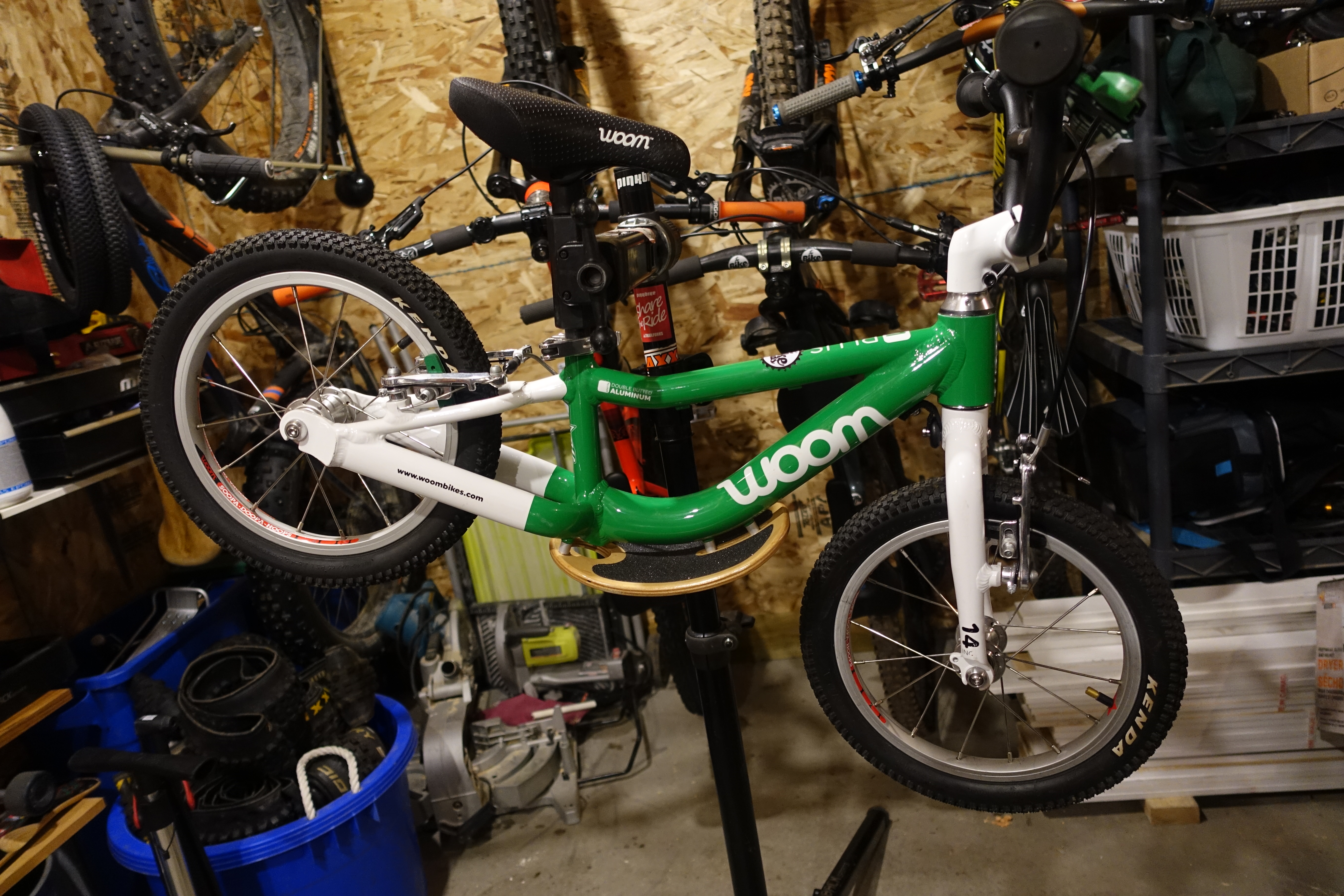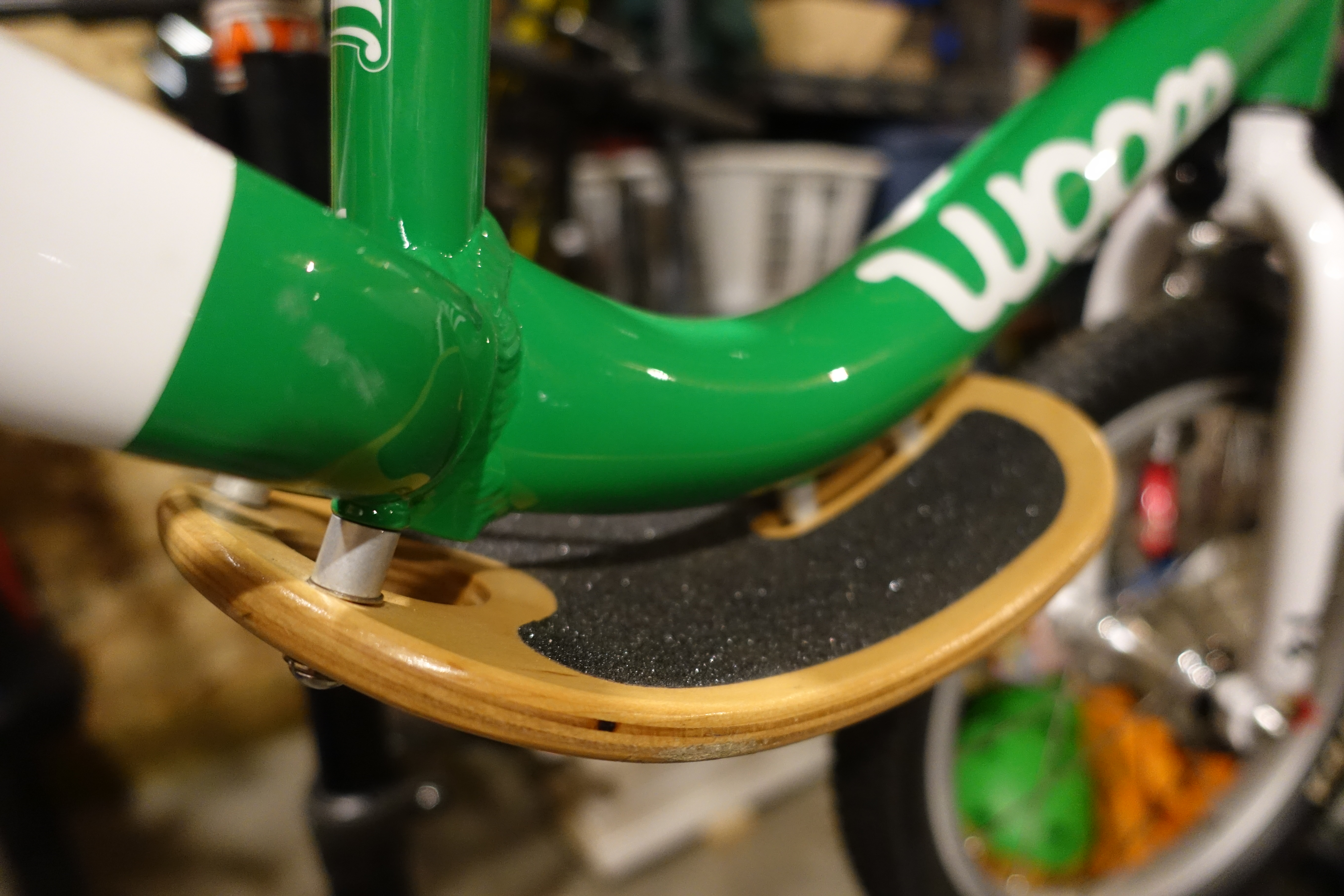 The Woom 1 Plus has all the same features as the Woom 1 and has added some additional confidence inspiring features for larger kids. A high rise BMX style handlebar that provides an upright striding position. Both front and rear v brakes have small reach levers. The rear lever and brake pads are green just like all other Woom pedal bikes. They also ship the Woom 1 plus with a removable foot rest that is a great learning tool for kids as they develop towards riding a pedal bike. The footrest is made of wood and looks like a skateboard. My daughter ended up calling it her “skateboard bike.”