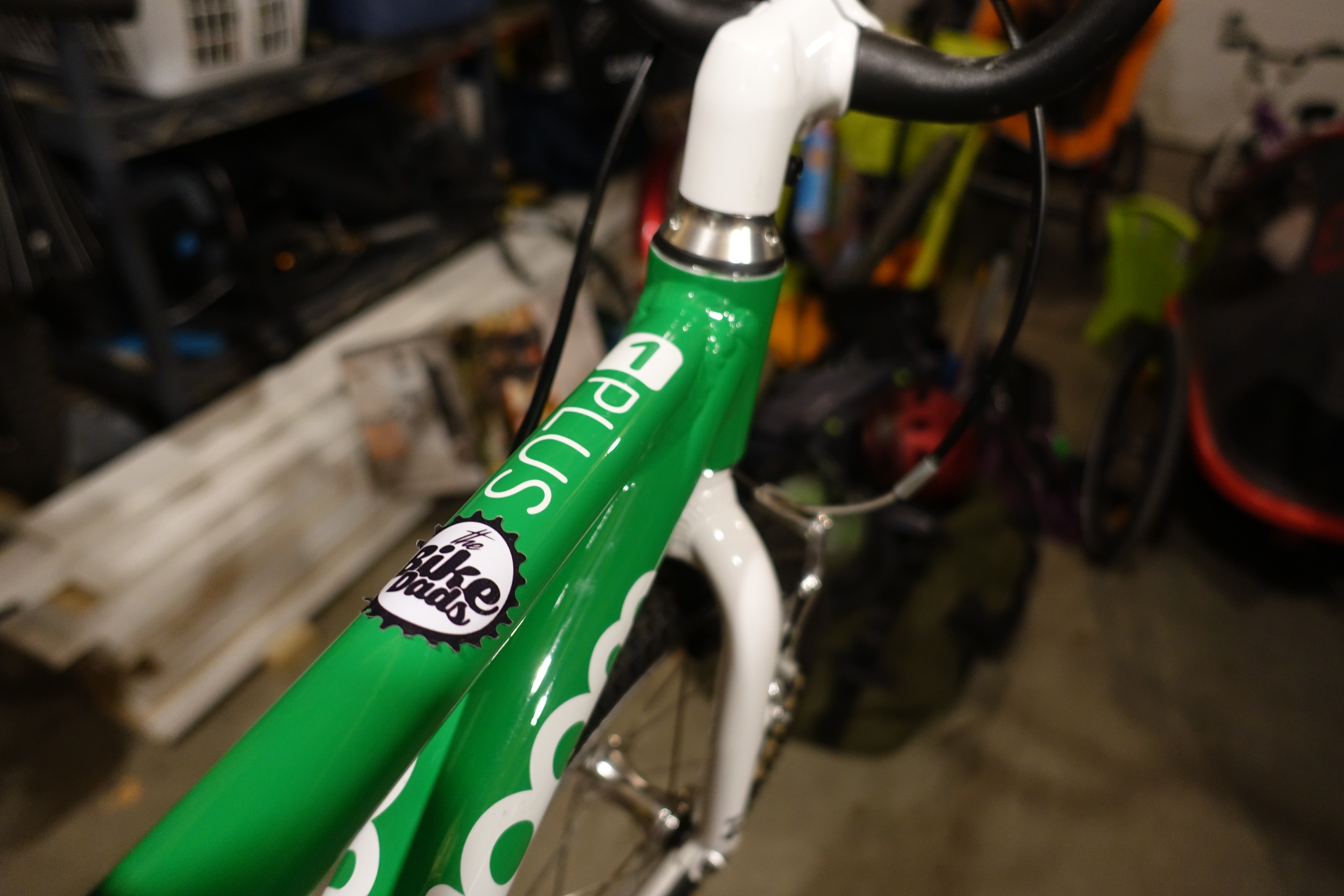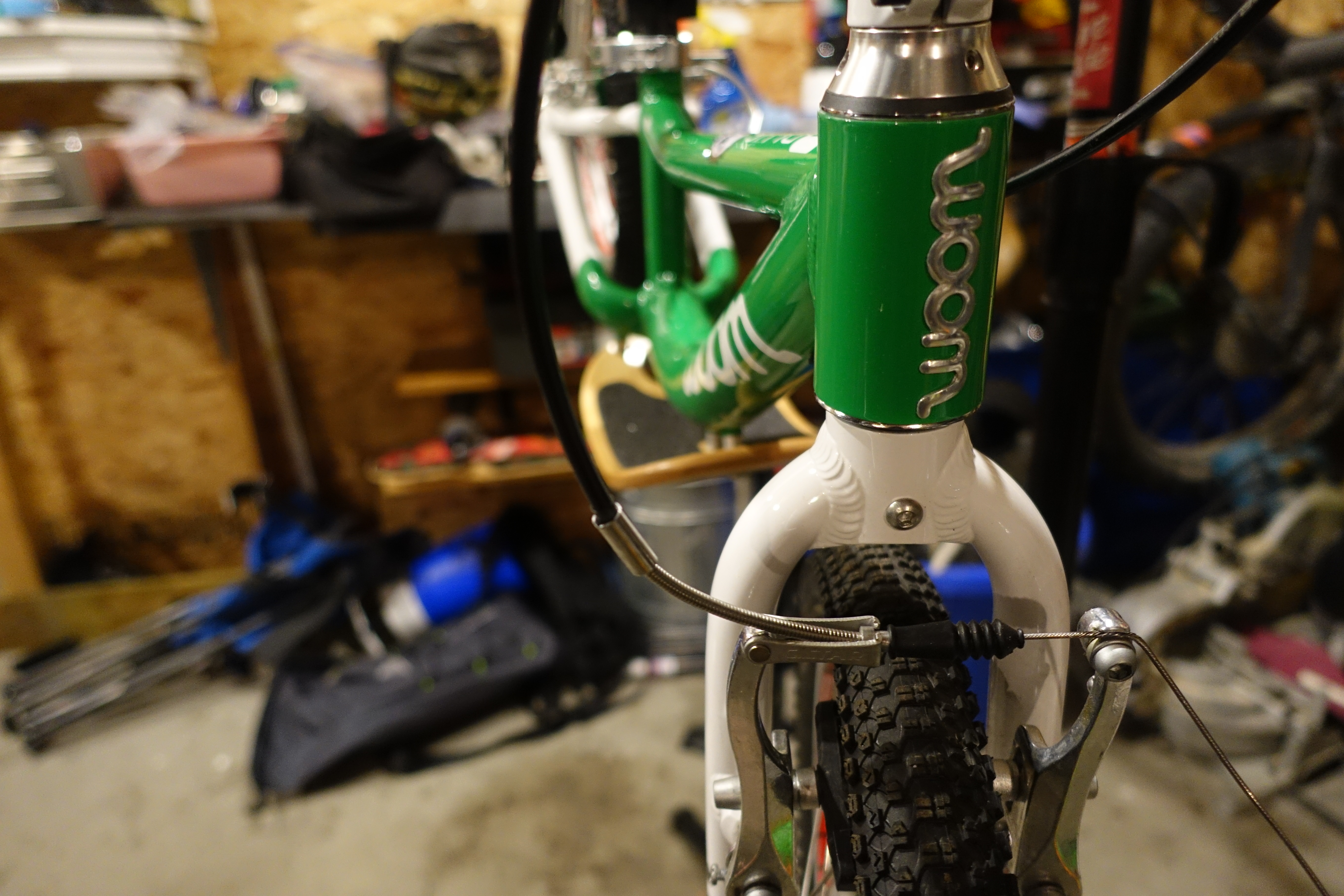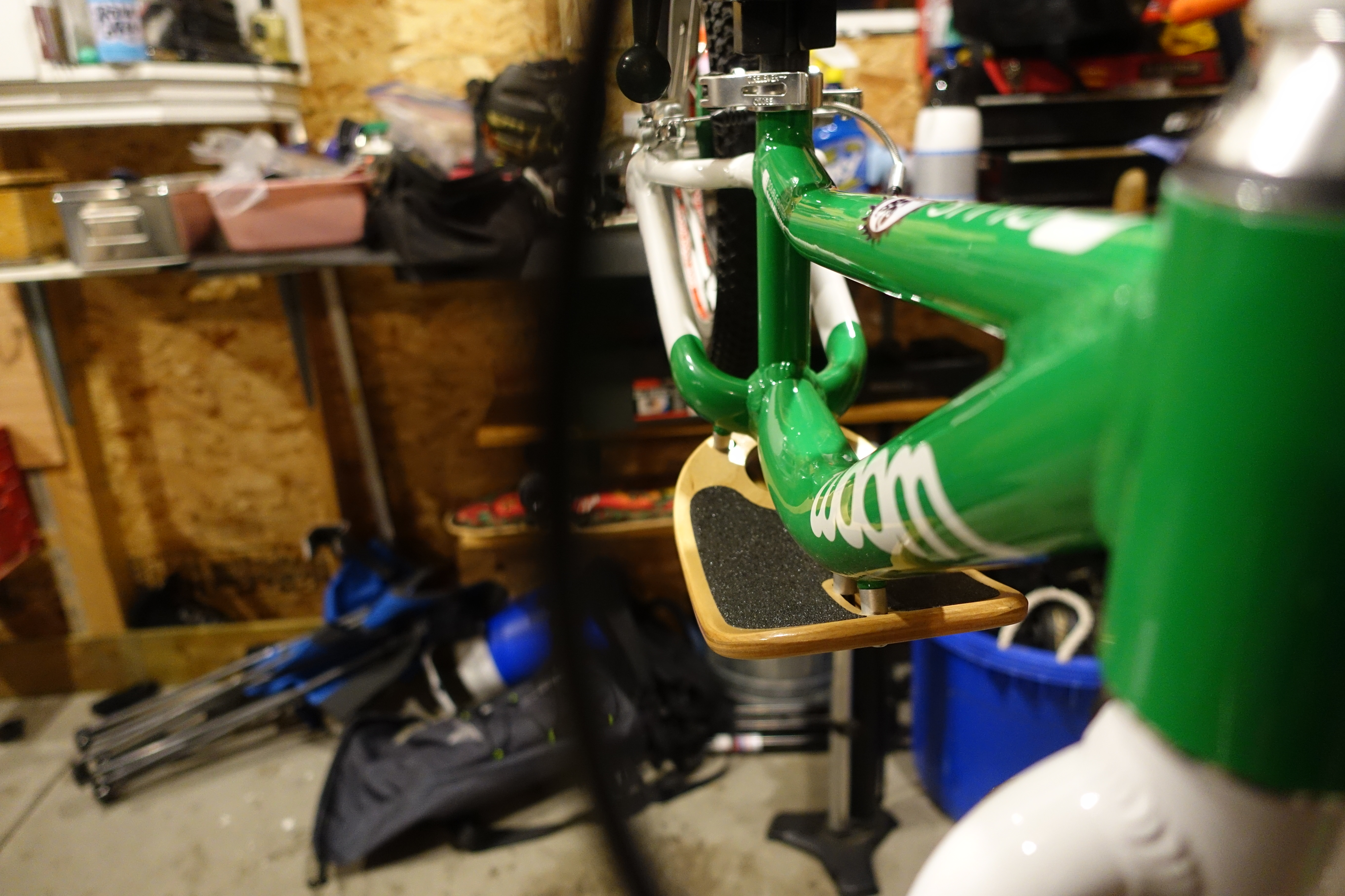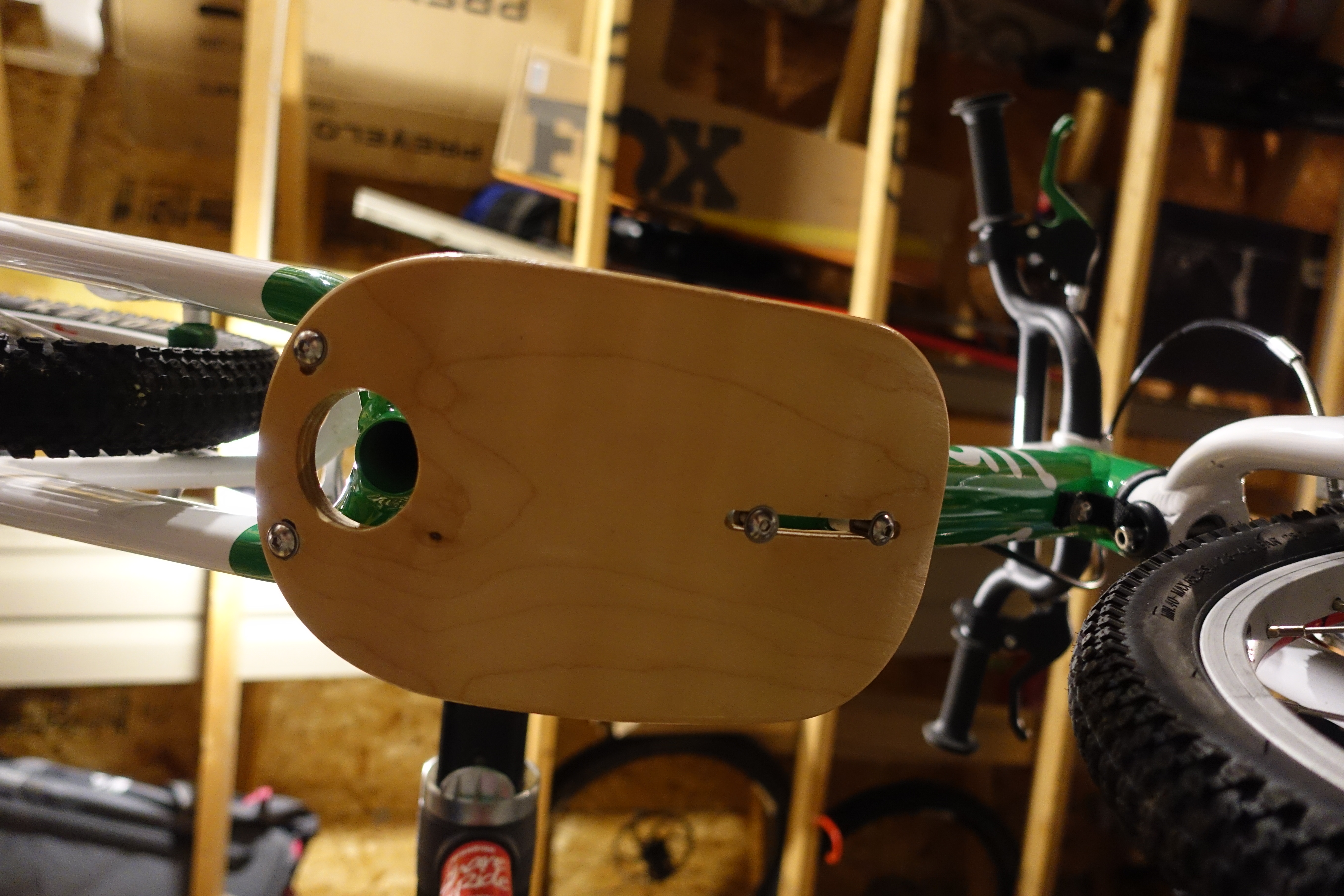 The Woom 1 Plus has all the same features as the Woom 1 and has added some additional confidence inspiring features for larger kids. A high rise BMX style handlebar that provides an upright striding position. Both front and rear v brakes have small reach levers. The rear lever and brake pads are green just like all other Woom pedal bikes. They also ship the Woom 1 plus with a removable foot rest that is a great learning tool for kids as they develop towards riding a pedal bike. The footrest is made of wood and looks like a skateboard. My daughter ended up calling it her “skateboard bike.”